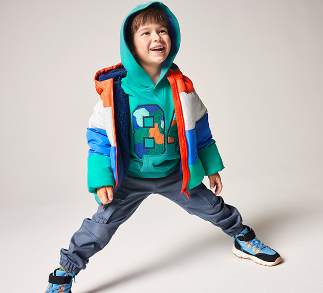 Beat the chill this season with our kids’ gilets, coats jackets and knits. Look for designs made with Stormwear, our water-repellent technology that keeps kids cosy and dry. Up the warmth by layering a sweatshirt/fleece underneath. The featured color block padded jacket is an ideal piece for staying snug! We also recommend this on-trend pink knitted jumper. Style tip: team soft pastel shades in warm fabrics with everyday jeans for a perfectly relaxed weekend outfit for the kids.