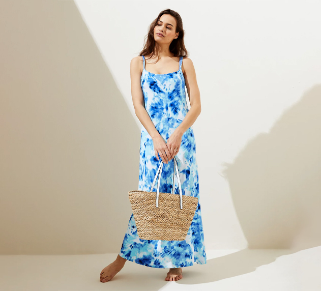 Embrace the holiday season in full bloom with a printed tie & dye dress. The featured maxi dress features a dainty print that will look just as chic with this season’s most-wanted sandals as it will with casual trainers. Accessorise with a straw cross-body bag, simple hoop earrings and the hair let loose.