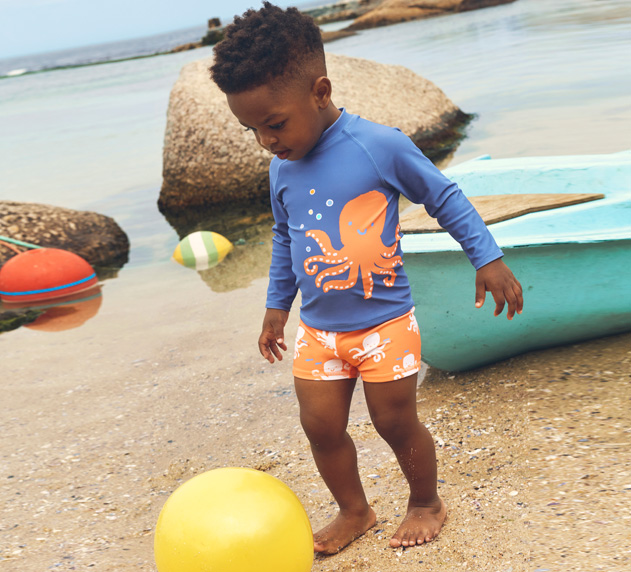 We all dread the sinking feeling that comes when we’ve forgotten to pack something crucial for the kids. Give yourself peace of mind and maximise hard-earned holiday relaxation time by packing a sturdy swimsuit. Let your little boy have fun in our octo-swim set. It’ll work hard inside the pool, and at the beach while your baby looks oh-so-cute