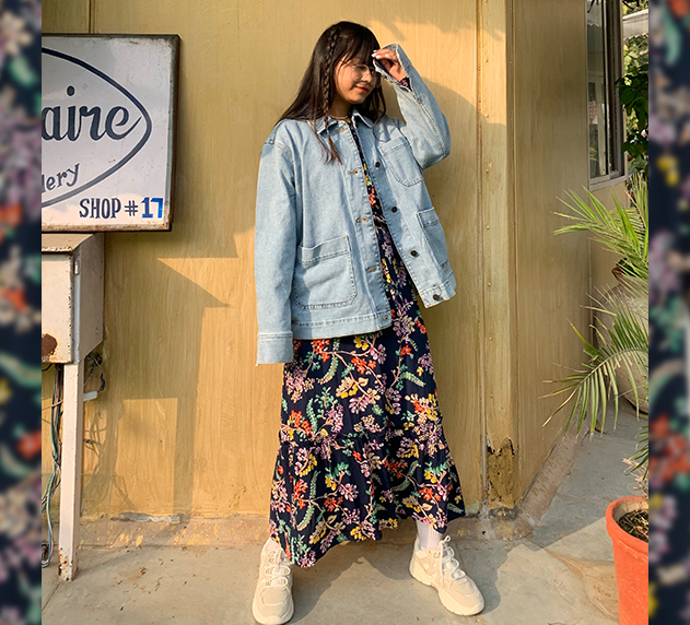 Swung, layered or draped – casual spring dresses bring with them multiple opportunities for styling. A denim jacket as a layering option always works, especially in this case when it’s thrown over a pretty floral number. Slip on a pair of a trainers and let your hair loose to have your casual game going strong!