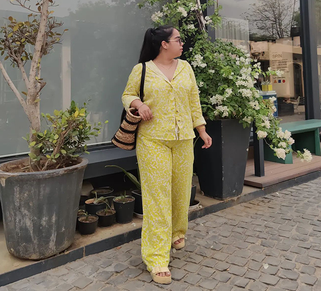 We weren’t kidding about the versatile fits. Our ace Insider and in-house stylist Simran sports this printed linen co-ord set effortlessly and elegantly. With a casual tote and flatforms in tow, she rocks her work meetings while she Rethinks workwear & is at her comfortable best while doing so - comfortable enough to grab a quick cuppa!