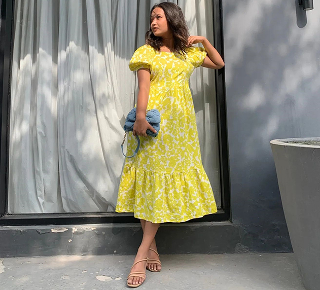 However, if co-ords is not your thing, don’t fret. We have the perfect dress for you in this cheerful print as sported by our Insider Nandini on the left. This comfortable linen midi dress will definitely make you stand out, the color, print, ruffle details and the square neck – we’re here for it. Nandini accessorizes it for a day out & about in the city. But you team it with stilletos and you’re good to go for the evening as well!