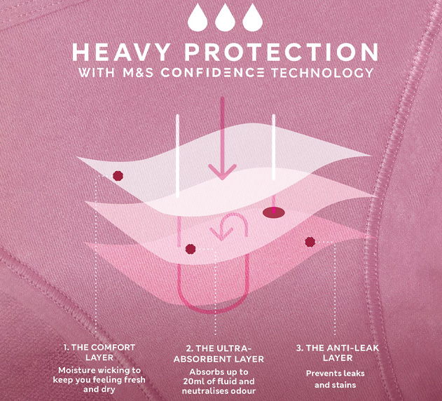 Our period knickers have three layers of protection The top layer is made from polyester that has moisture-wicking properties. The middle layer can absorb up to 20ml of liquid, neutralising any odours. Finally, there’s a waterproof layer to stop any leaks. Plus, the gussets on all our period knickers have been extended to ensure that there is no leakage.